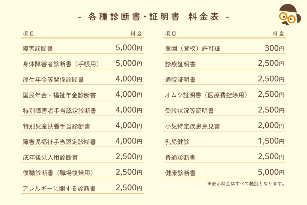 各種診断書・証明書 料金表 2026 4/14 お知らせ 2026年4月14日 いつも当クリニックをご利用いただきありがとうございます。 当クリニックで発行しております診断書・証明書の料金について、以下の通りお知らせいたします。 お知らせ よかったらシェアしてね! URLをコピーしました! URLをコピーしました! 【メディア掲載】2025秋・冬号「ママぶれ vol.2」に掲載されています この記事を書いた人 admin_karekore 関連記事 【メディア掲載】2025秋・冬号「ママぶれ vol.2」に掲載されています 2025年10月20日 「非常用発電機」を設置しています 2025年10月20日 【メディア掲載】長崎新聞に掲載されました 2025年4月2日 「クリニック紹介映像」を公開しました 2025年4月1日 「開院記念式典および内覧会」を開催しました 2025年3月30日 かれこれ先生のこどもクリニックHPを開設しました 2025年3月30日